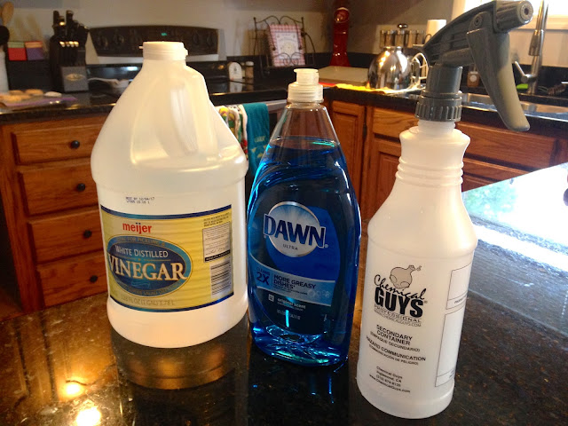 You will need 1 cup of vinegar and 1 cup of Blue Dawn dish soap. The first thing you want to do is heat up the cup of vinegar. I put mine in the microwave for a minute and a half. Put the warm vinegar in your spray bottle and then add your cup of dish soap.