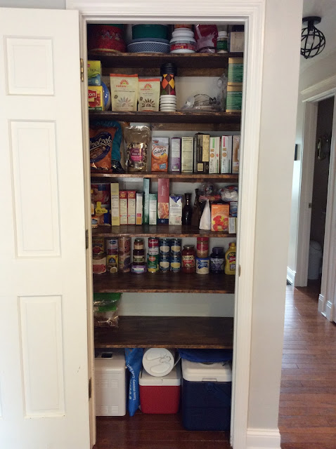 It took about an hour or two to take out everything in the pantry, wipe down the shelves, and mop the floor. Our pantry now looks like this (!):